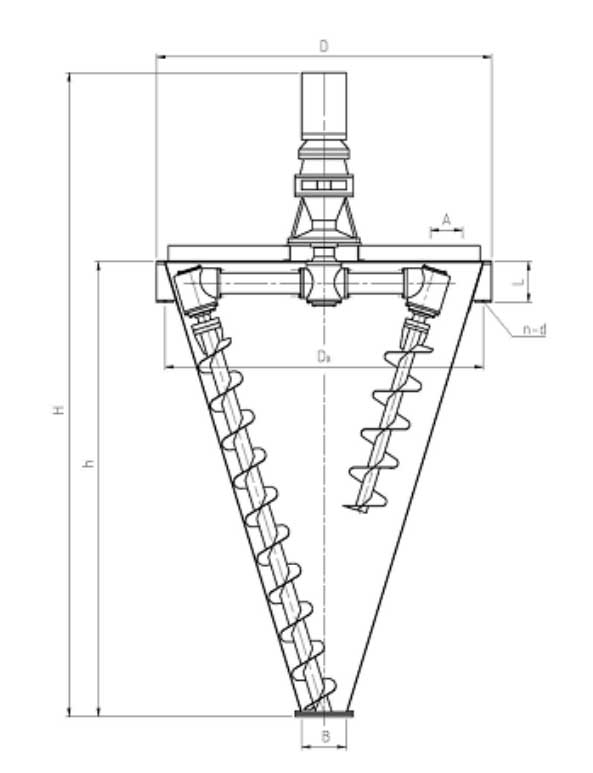 混合容器為倒錐體,當 V<10m3 時機內兩根螺旋采用懸臂非對稱結構,長螺旋靠錐壁安裝,短螺旋靠近中心部位安裝;長螺旋直徑小,短螺旋直徑大;因而大大增強了中心區域的攪拌效果,提高了混合效率和混合精度。